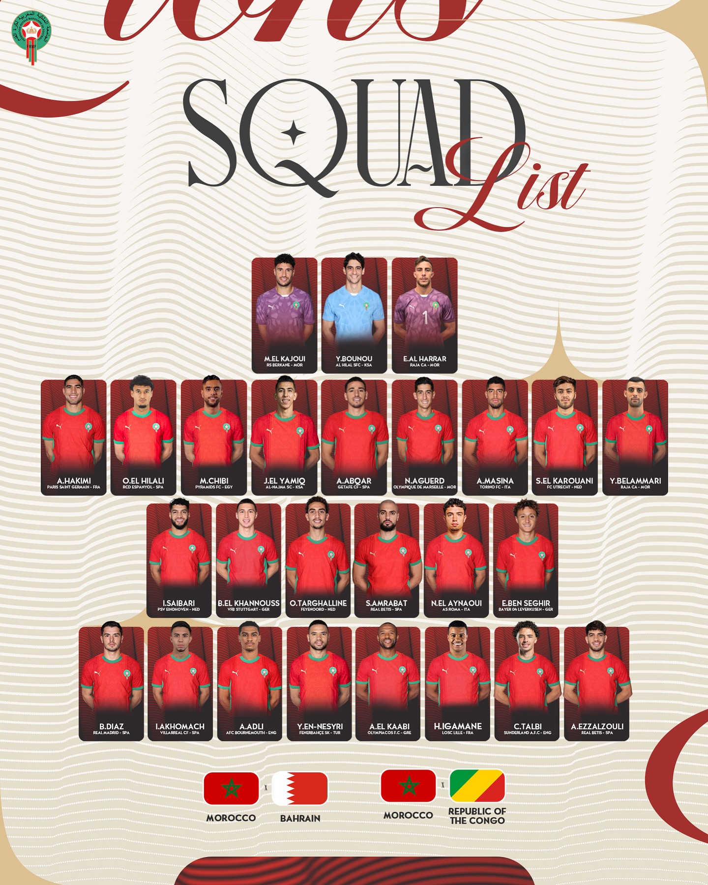 أعلن الناخب الوطني "وليد الركراكي"، يومه الخميس 2 أكتوبر الجاري، عن قائمة المنتخب الوطني استعداداً لمواجهتي البحرين ودياً، والكونغو ضمن الجولة الثامنة الأخيرة من تصفيات كأس العالم 2026، المقررتين في 9 و14 أكتوبر 2025.