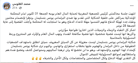 وأكد الغلوسي أن هذه القضية “لا تهم شخصه بقدر ما تهم قضايا الفساد ونهب المال العام والإثراء غير المشروع”، مشدداً على أنها “ترتبط بمبدأ ربط المسؤولية بالمحاسبة، وهو ركن أساسي في أي مشروع إصلاحي جاد”.