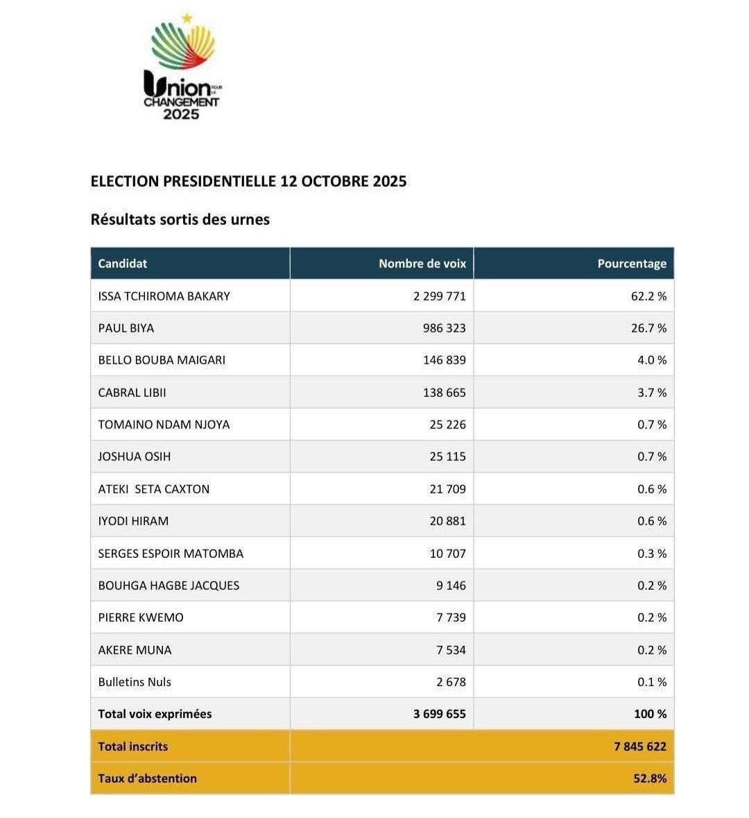 A major dispute has erupted in Cameroon following the announcement of results from the 2025 presidential election. The official figures, released by the National Counting Commission from the Palais des Congrès in Yaoundé, named RDPC candidate Paul Biya as the winner with 53.66 percent of the vote, ahead of Issa Tchiroma Bakary, who received 35.19 percent. These results have been transmitted to the Constitutional Council for the definitive proclamation, but they are facing intense opposition.
